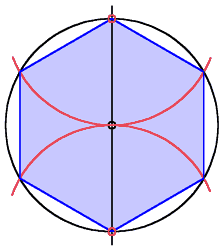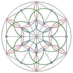 Die Kreise um die Ecken mit halber oder ganzer Seitenlänge als Radius ergeben einen gotischen Sechspass. | ![]() |