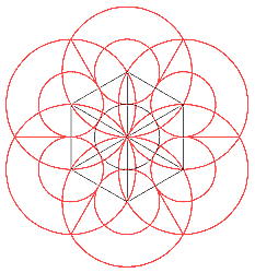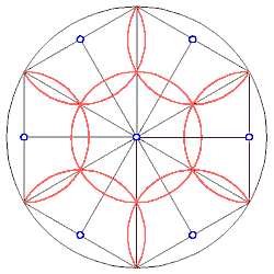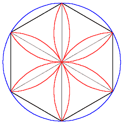 Der Umfang eines Kreises lässt sich mit seinem Radius in sechs gleiche Teile teilen. Aus den Radien in allen Ecken entsteht eine solche Blütenform. | |