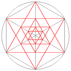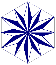 Wenn jeder zweite Punkt mit geraden Linien verbunden wird, ergeben zwei gleichseitige Dreiecke einen sechszackigen Stern. | |