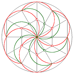 Kreisbögen um die Mitten der Strahlen zu den Ecken und den Seitenmitten ergeben diese leicht zu konstruierende Spiralform. | ![]() |