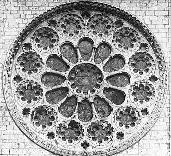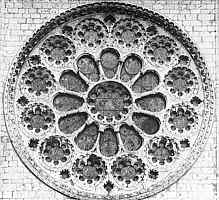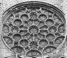 | An der Westfassade misst die großartige Rose 13,36 m im Durchmesser. Außen ist sie ein riesiges Rad, innen eine wunderschöne Rose und ein Meisterwerk von Licht und Geometrie. | ||