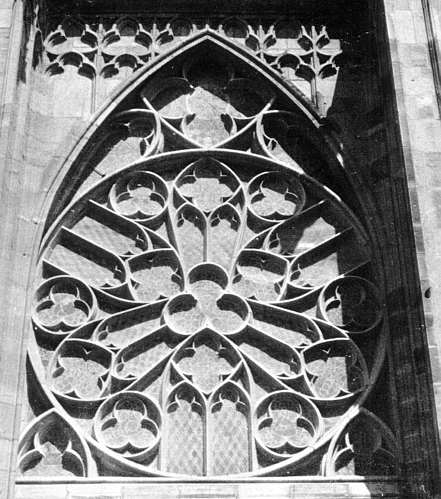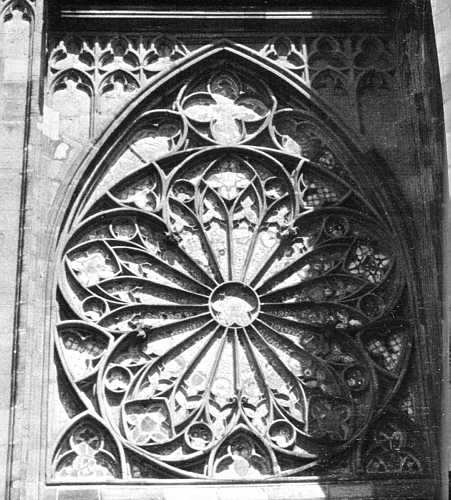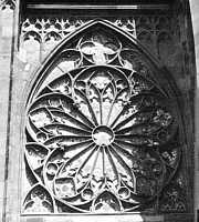 Im 14. Jh. entwickelte sich das Maßwerk in vielen phantasievollen Zeichnungen. In St. Katharina wurden zwei Rosen in die Südseiten des Schiffes gebaut, eine auf einem dreifachen und die andere auf einer fünffachen Geometrie fußend. | ![]() |