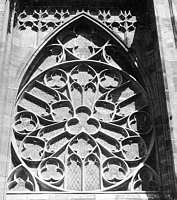 asymmetrische Lanzetten werden häufig, ebenso der Wechsel von zentripedalen oder zentrifugalen Anordnungen, bis zu den vielfältigen Fischblasenmustern der Flamboyant-Rosen bis ins 15./16. Jh. Auch Stern-Muster sind jetzt anzutreffen. Gleichzeitig mit der Formenentfaltung an der Großarchitektur erfolgt die Übernahme in die Kleinarchitektur (Baldachine u.a.).